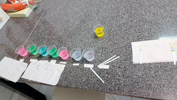 Durante o experimento, foram analisadas diversas amostras cotidianas, como vinagre, suco de limão, leite, fermento químico, pastilha antiácida, sabão em pó, detergente, bicarbonato de sódio, leite de magnésia, shampoo, condicionador, sabonete, açúcar, sal, água de torneira e água sanitária.